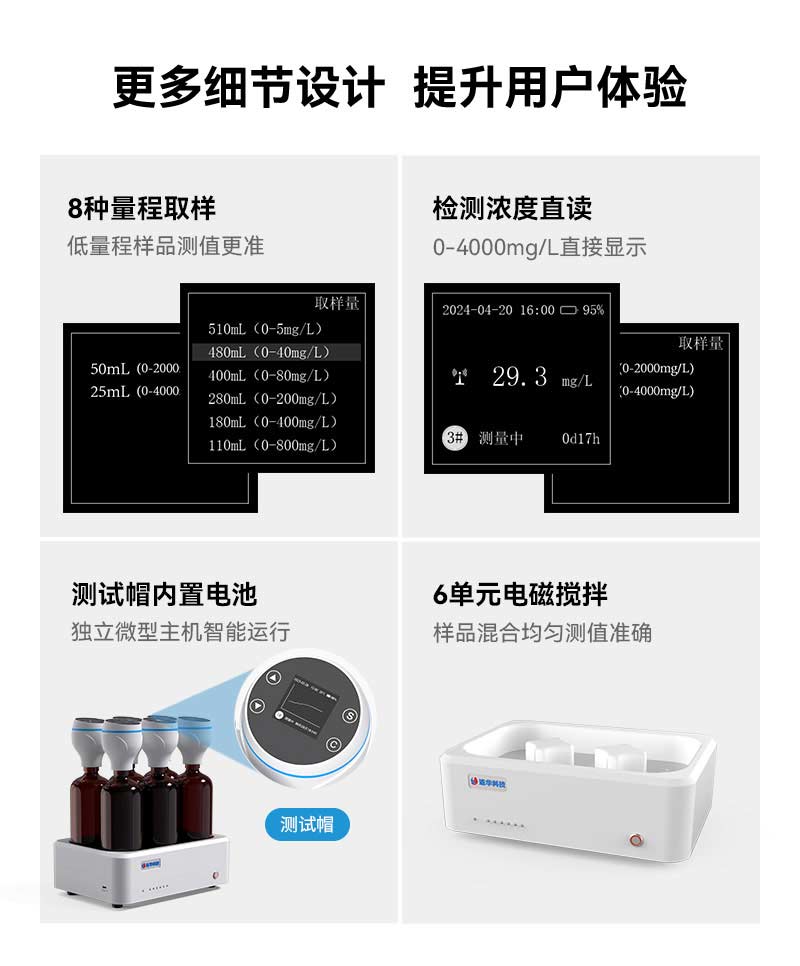 值得一提的是,LH-BOD306的每個測試帽都相當于一個微型主機,內置CR-P2電池和1.5吋OLED屏幕,可獨立運行并查看檢測數據、數據曲線圖等信息。這一創新設計使得即使在主機短暫停電的情況下,測試也不會受到影響,確保了數據的連續性和完整性。