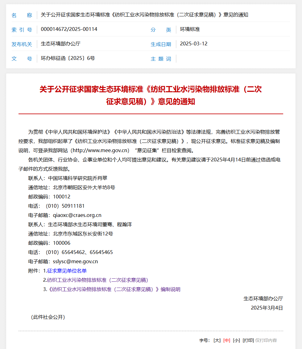 日前,為為貫徹《中華人民共和國環(huán)境保護(hù)法》《中華人民共和國水污染防治法》等法律法規(guī),完善紡織工業(yè)水污染物排放管控要求,生態(tài)環(huán)境部起草了《紡織工業(yè)水污染物排放標(biāo)準(zhǔn)(二次征求意見稿)》,現(xiàn)公開征求意見。