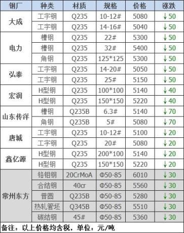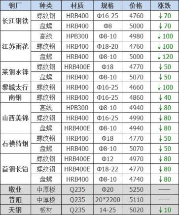 25日12:00起江陰西城刨花類下調50-60,其他不變,調后:精爐料4000重廢3890中廢3830普通爐料3770鋼筋頭4000沖子3890-3940冷熱軋料3790-3890爐料壓塊3600鐵皮壓塊3300鋼刨花3600數控刨花3510普通刨花3420刨花壓塊3360刨花長絲3310含稅單位:元/噸。