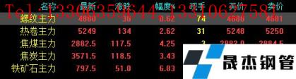 今日螺紋主力期貨漲30,收報4880,漲幅0.62%;熱卷主力漲134,收報5249,漲幅2.62%;焦煤主力漲117.5,收報2882.5,漲幅4.25%;焦炭主力漲118.5,收報3571.5,漲幅3.43%;鐵礦石主力漲51,收報797.5,漲幅6.83%。